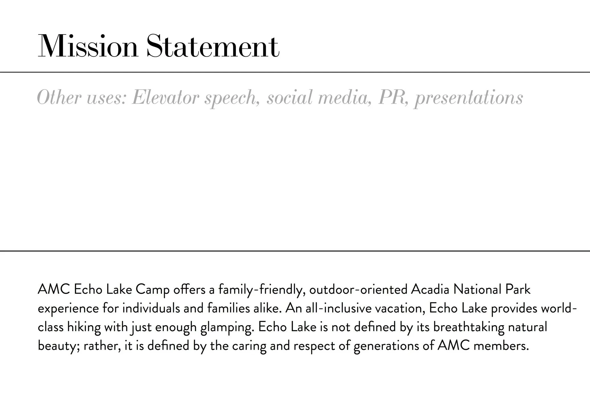 Mechanism: A Board-level alignment presentation to define the Mission, Values, and Vision for the AMC Echo Lake Camp, Acadia National Park in Maine.