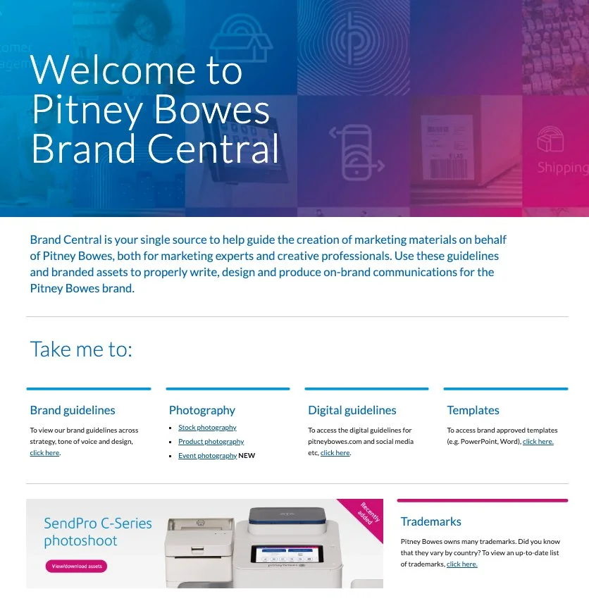 Pitney Bowes is a 100+ year old brand. As part of the rebrand, which I helped lead, brand guidelines were created. In addition, I created a Digital Asset Management System, Pitney Bowes Brand Central, as a global repository of approved assets. This enabled Creative Services to ensure that all materials were consistent, no matter who created it, internally or via an agency partner.