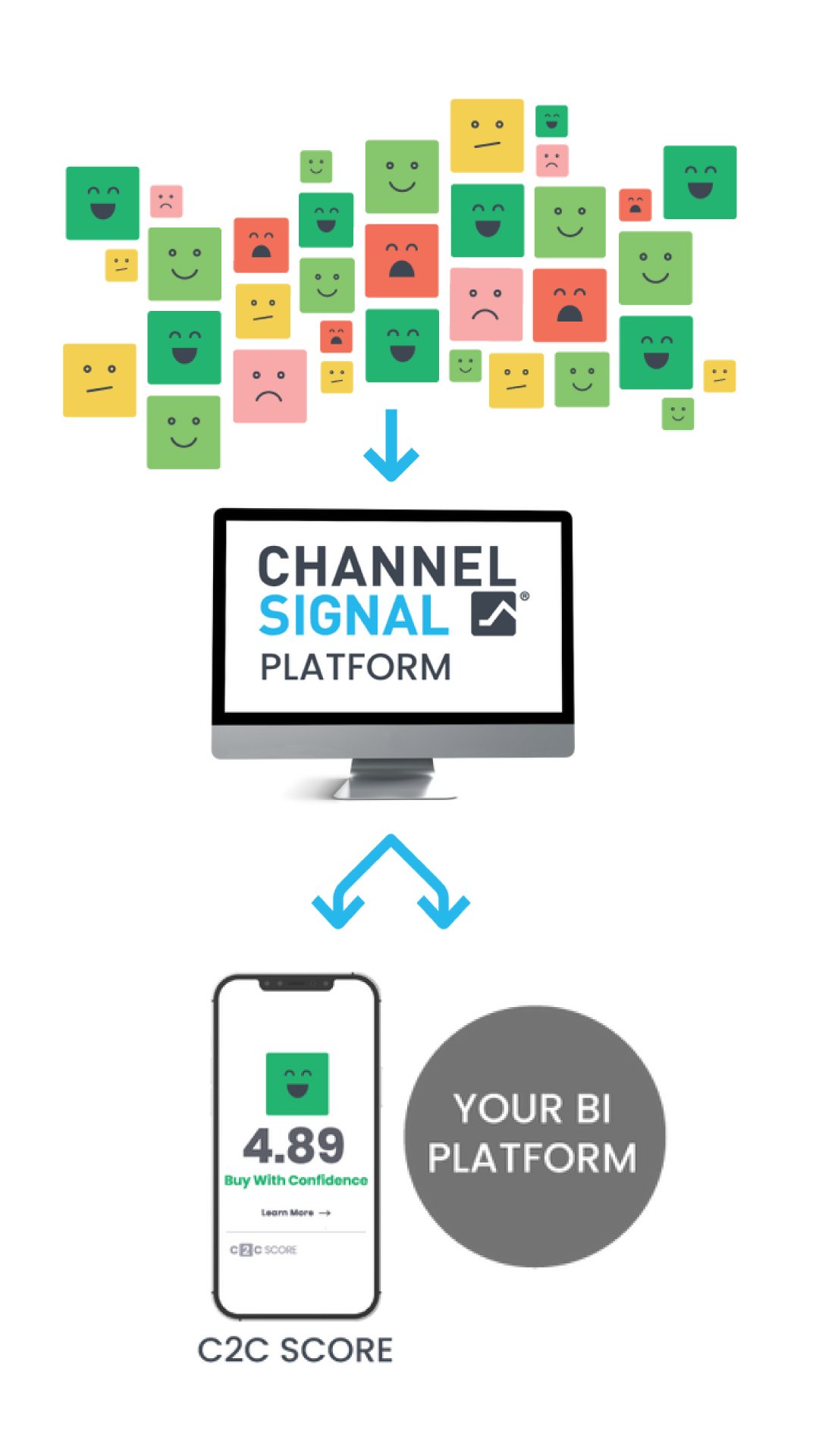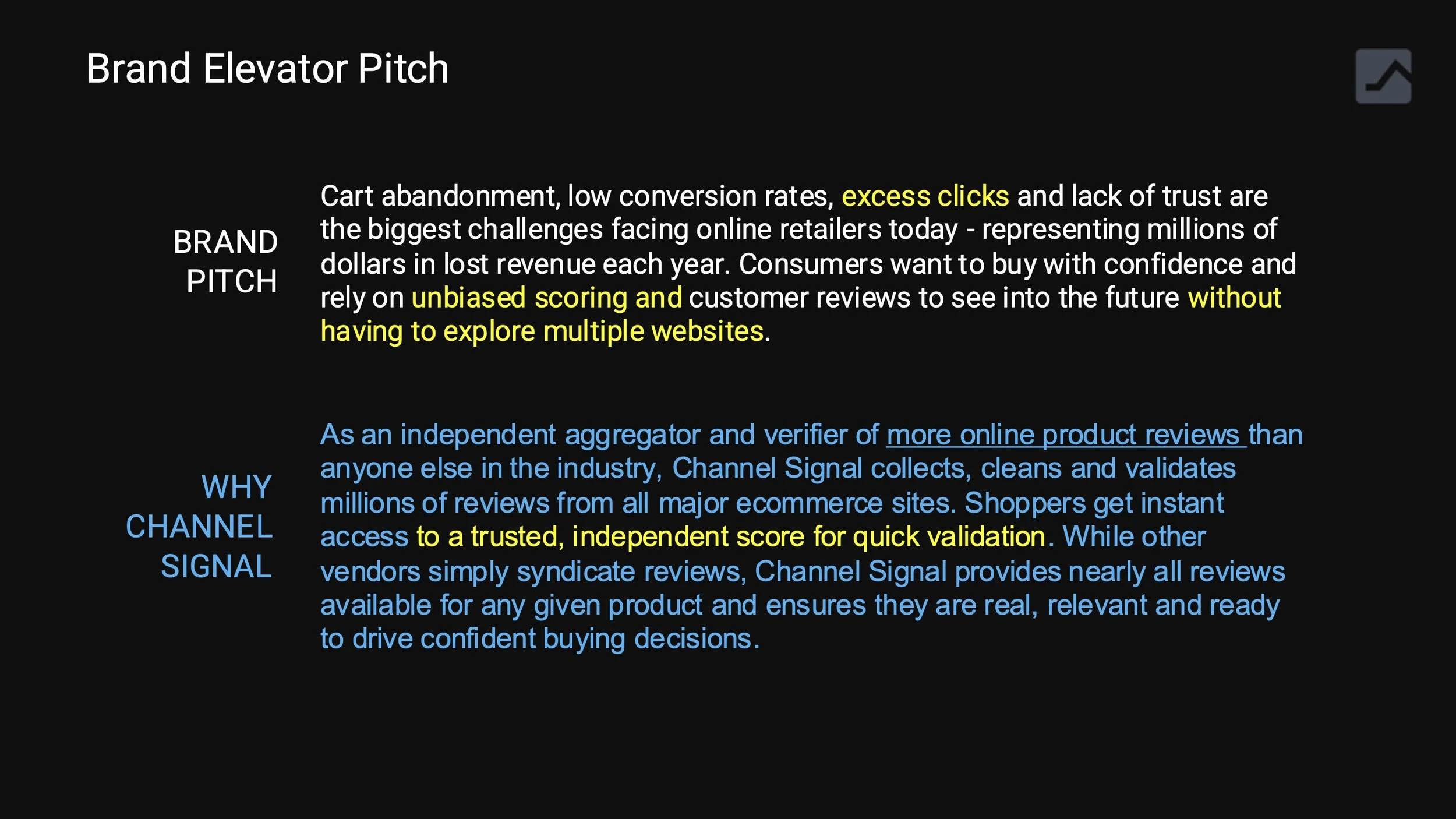 Channel Signal is the Internet’s first online review aggregator. It takes reviews from agross the internet, sorts the reviews with its proprietary SaaS platform, and creates what is known as the C2C Score. This was difficult for the brand to communicate. In addition to positioning the brand, I designed much of their materials, including web and the process chart shown here.